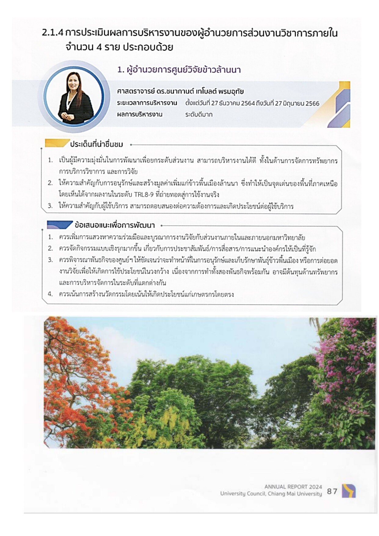 โดยผู้อำนวยการศูนย์วิจัยข้าวล้านนา รองศาสตราจารย์ ดร.ชนากานต์ เทโบลต์ พรมอุทัย ได้ผลการประเมินระดับ ดีมาก